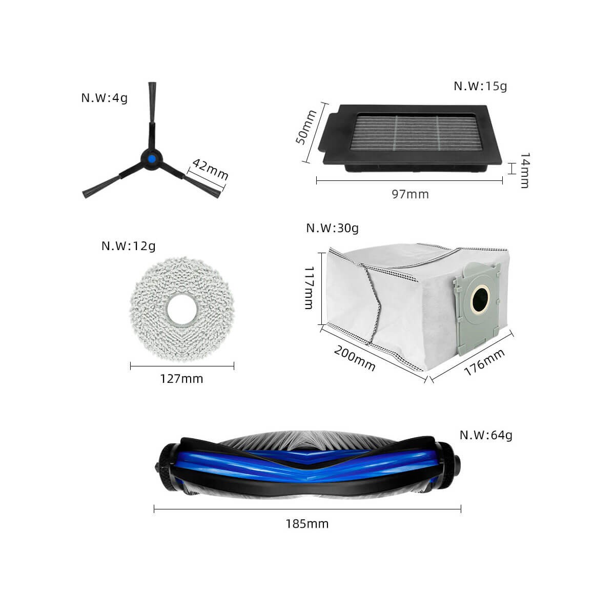 Ensemble de pièces de rechange pour aspirateur robot comprenant : 1 rouleau principal, 2 brosses latérales, 2 serpillères, 2 filtres et 2 sacs à poussière.