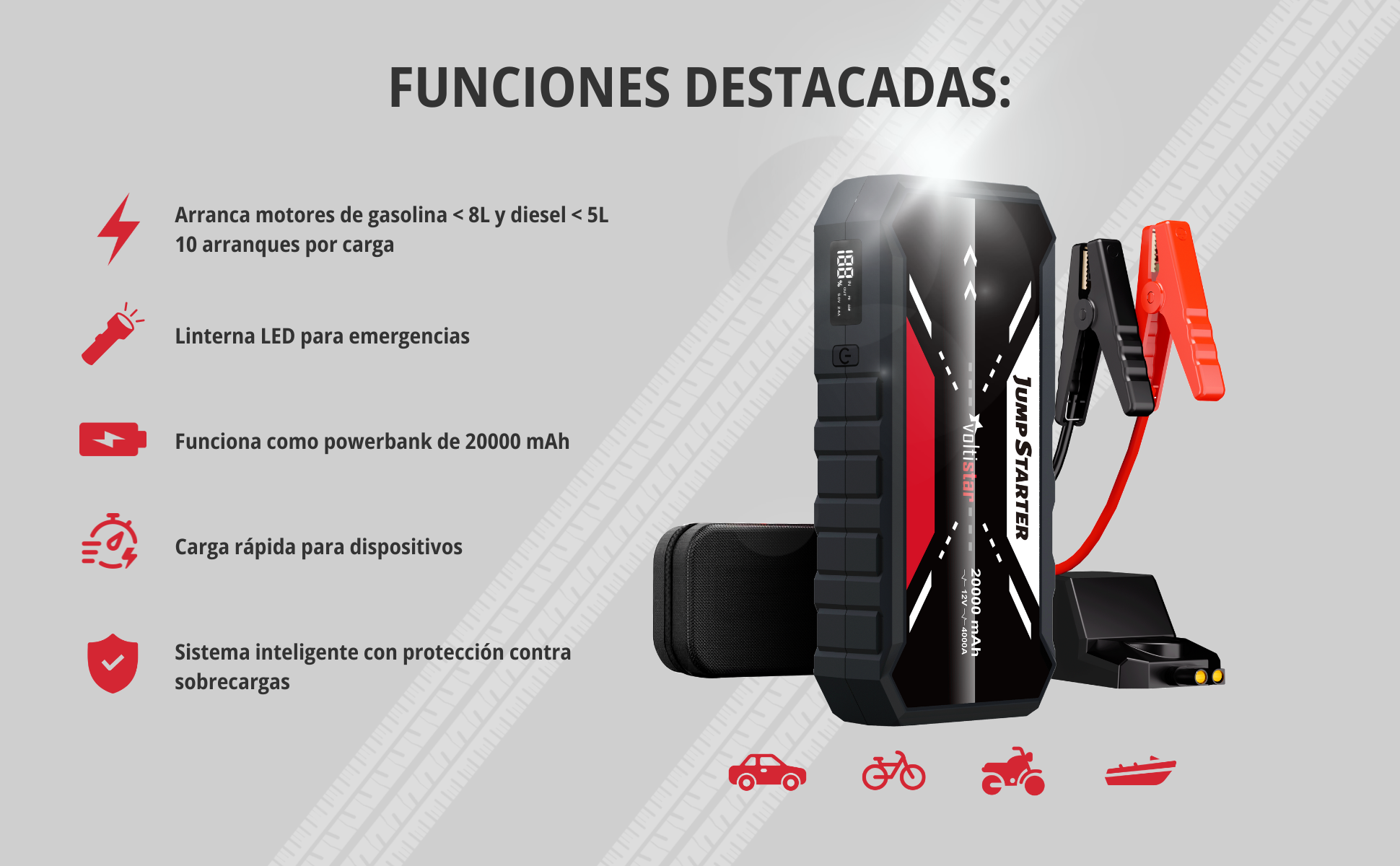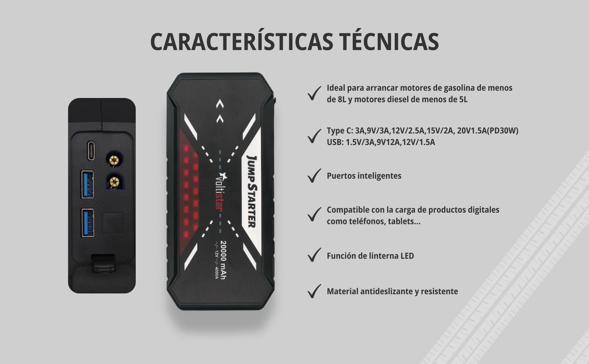 - Capacité de démarrage : Peut démarrer des moteurs à essence jusqu'à 8,0 L (80 000 cm3) et des moteurs diesel jusqu'à 5,0 L (5 000 cm3).