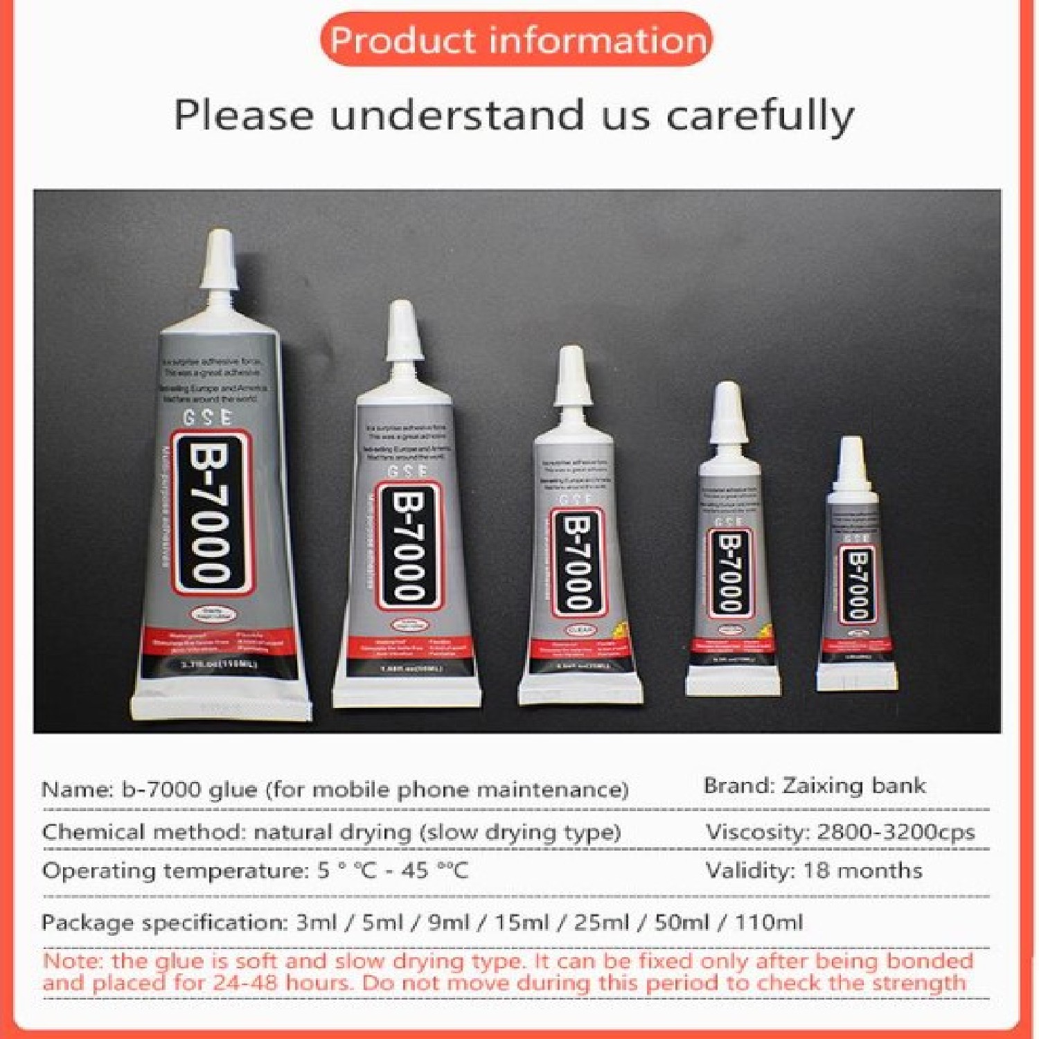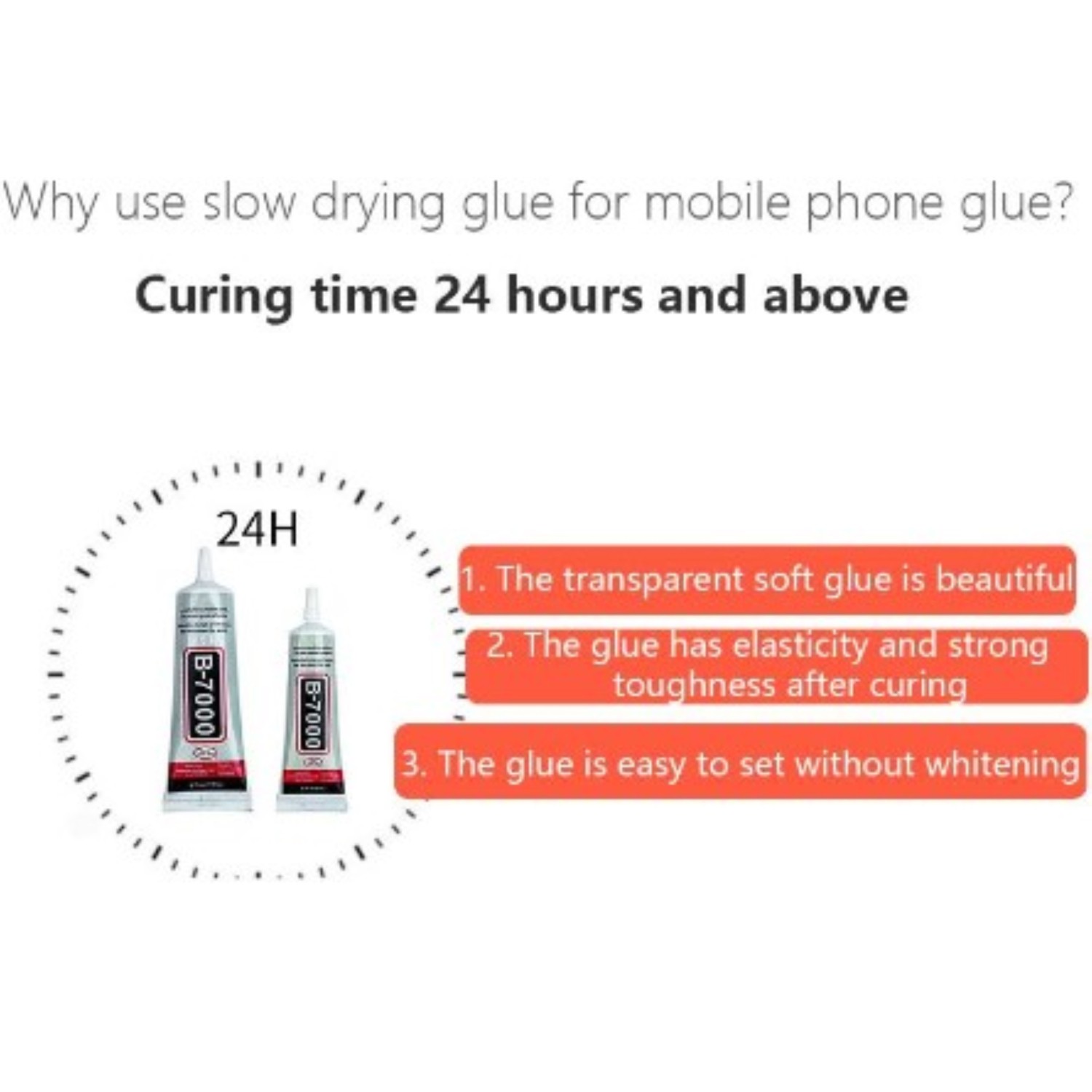 La colle B7000 est idéale pour les petites pièces, offre une finition transparente et sèche rapidement. Très élastique, imperméable et résistante aux vibrations, elle laisse une texture lisse. Elle convient parfaitement à la céramique, au plastique, au métal, au nylon, à la fibre, au PVC, au PE, au PP, à l'ABS, au cuir et à d'autres matériaux courants.