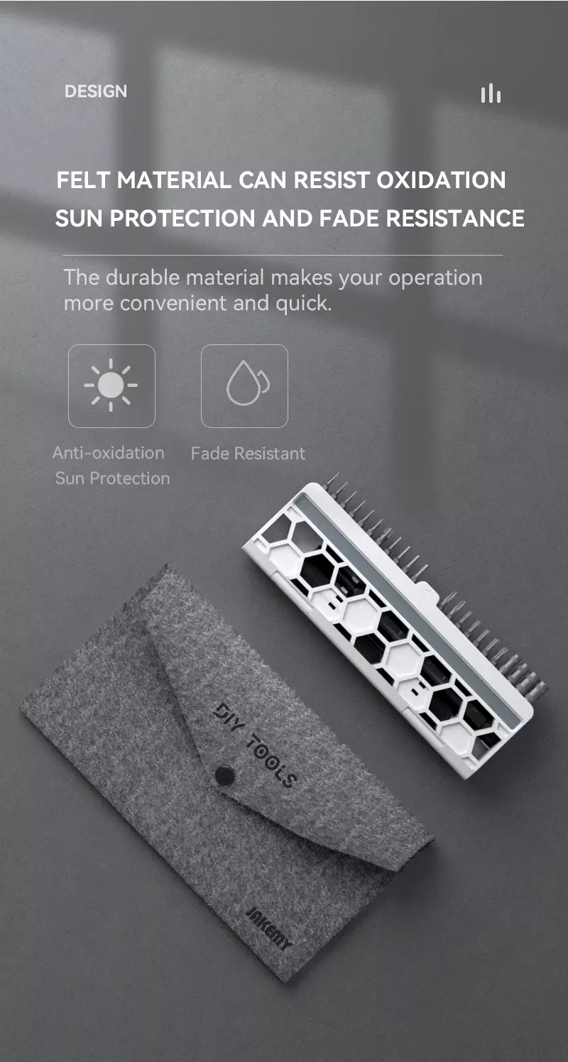 El Jakemy JM-8184 es un kit de destornilladores de precisión pensado para mantenimientos rápidos, organizados y eficientes. Su estuche de fieltro de alta calidad proporciona una excelente resistencia a la oxidación, la decoloración y los impactos, garantizando una protección óptima de todas las herramientas incluidas.