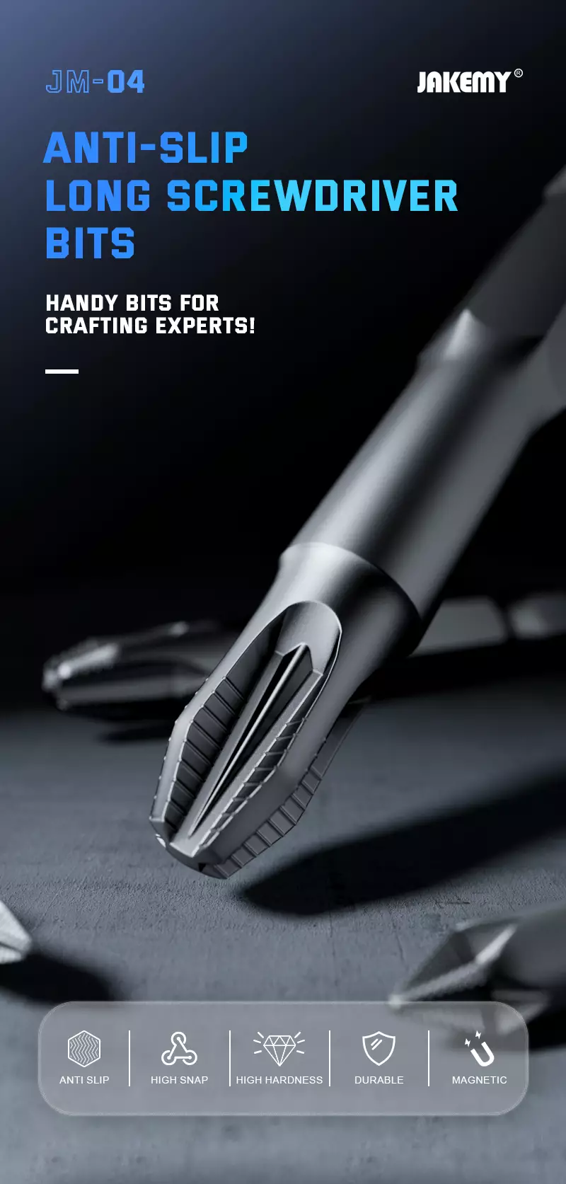 Le punte lunghe antiscivolo Jakemy JM-04 sono progettate per offrire maggiore portata e una presa sicura nei lavori di riparazione e montaggio. La loro costruzione in materiali ad alta resistenza garantisce una lunga durata, mentre il design antiscivolo consente di lavorare con maggiore precisione anche su viti complicate o di difficile accesso.