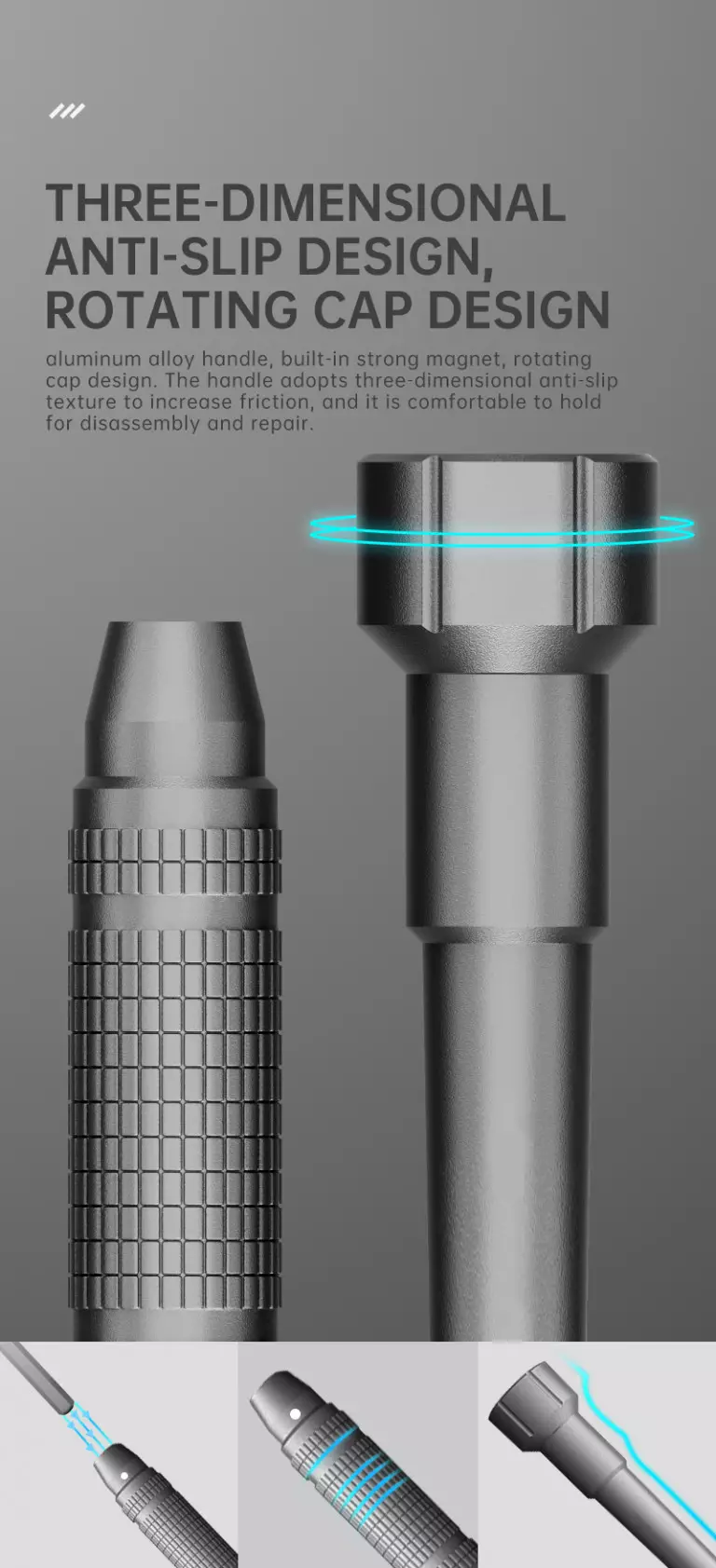- Cabo de liga de alumínio com tampa giratória e textura antiderrapante em 3D para melhorar a aderência.