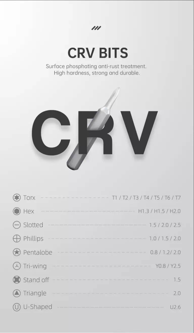 - Pontas CR-V de alta dureza com tratamento antioxidante por fosfatização.